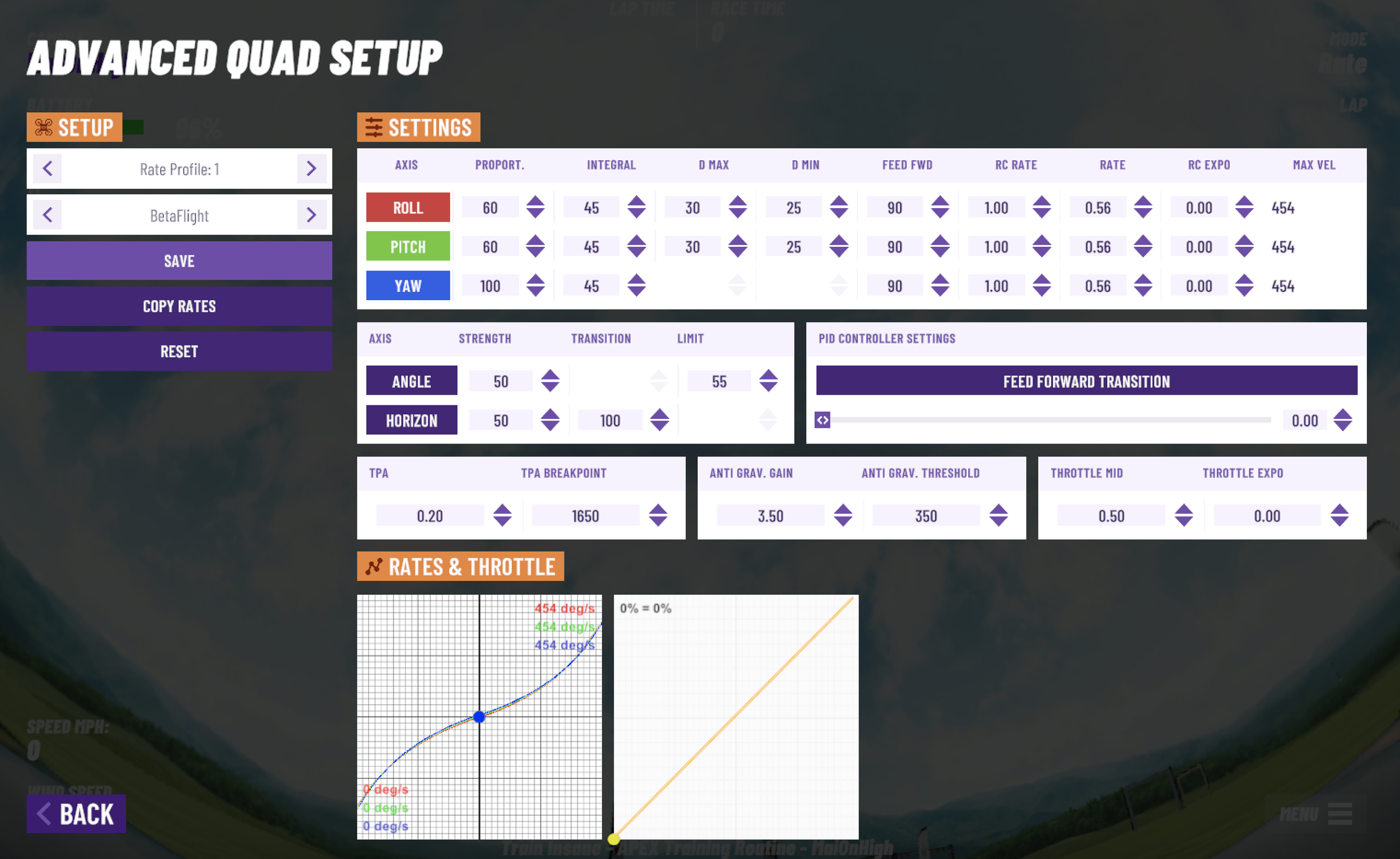 Many of you have asked me to share the settings I have on my velocidrone as well as my drone settings, PIDS and rates! As the Train Insane Velocidrone is picking up – I needed to come up with an answer that would fit everyone’s needs and be easy to share while not wasting time on the video.