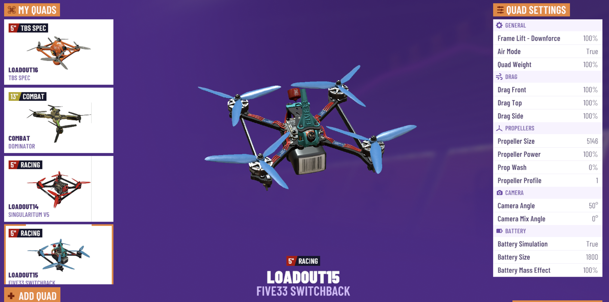 As a drone I have picked the Five33 Switchback – reason being – this is the closest frame and spec to what I am flying in real life (QAAD SKINNY). Be sure to always pick up a drone with frame and specs the most similar to what you are currently flying to get the most “real feel” results.